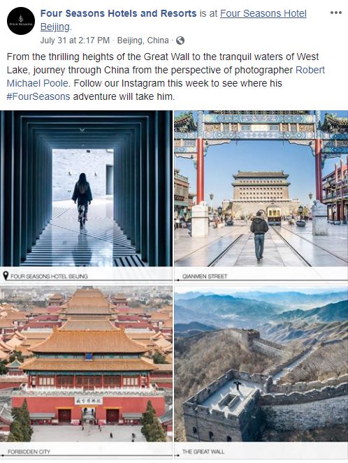 The Facebook feed of Four Seasons is largely repurposed content from Instagram. On both networks, the brand shares lots of user-generated content with hashtags like #ExperienceFS and #WakeUpWithFS (breakfast in bed, anyone?). In July, the content spotlighted photojournalist Robert Michael Poole as he adventured through China. For five days straight, Four Seasons posted daily album posts of Poole’s work—including nine Four Seasons properties. This is a great example of a brand giving structure to influencer or fan-shared content.