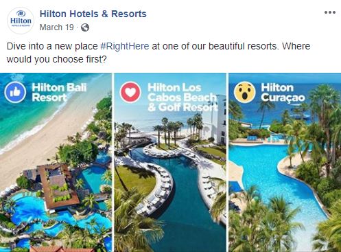 There are Hilton Hotels & Resorts everywhere, and the brand does a great job communicating its range on Facebook. Instead of focusing on one property per post, Hilton finds creative ways to feature multiple destinations in one—and the posts always get fans involved. Hilton polls its audience by having them vote on where they want to vacation using Facebook reactions (👍 for Hilton Bali Resort or ❤️ for Hilton Los Cabos) or by asking them to comment with specific emojis (East Coast 🍎 or West Coast 🌴). Most recently, Hilton posted a travel roulette video, asking users to screenshot a quick-paced slideshow to determine the perfect end of summer destination.