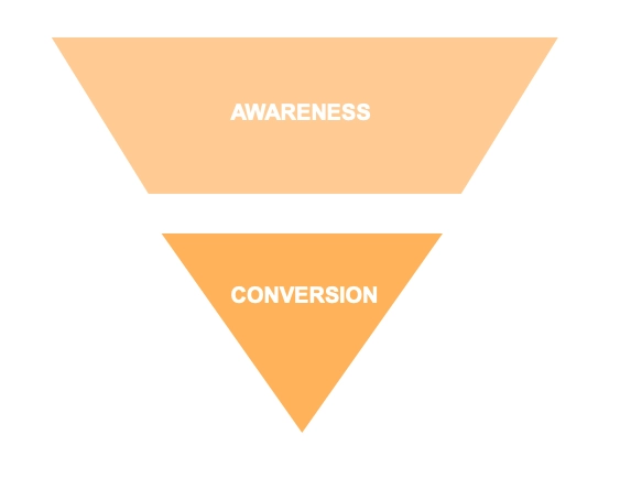 In paid social, this is what we call the funnel. Depending on your strategy, you may have any number of layers, but every funnel has awareness at the top and conversion at the bottom. On some social platforms, you even have the ability to optimize an ad for a specific funnel stage.